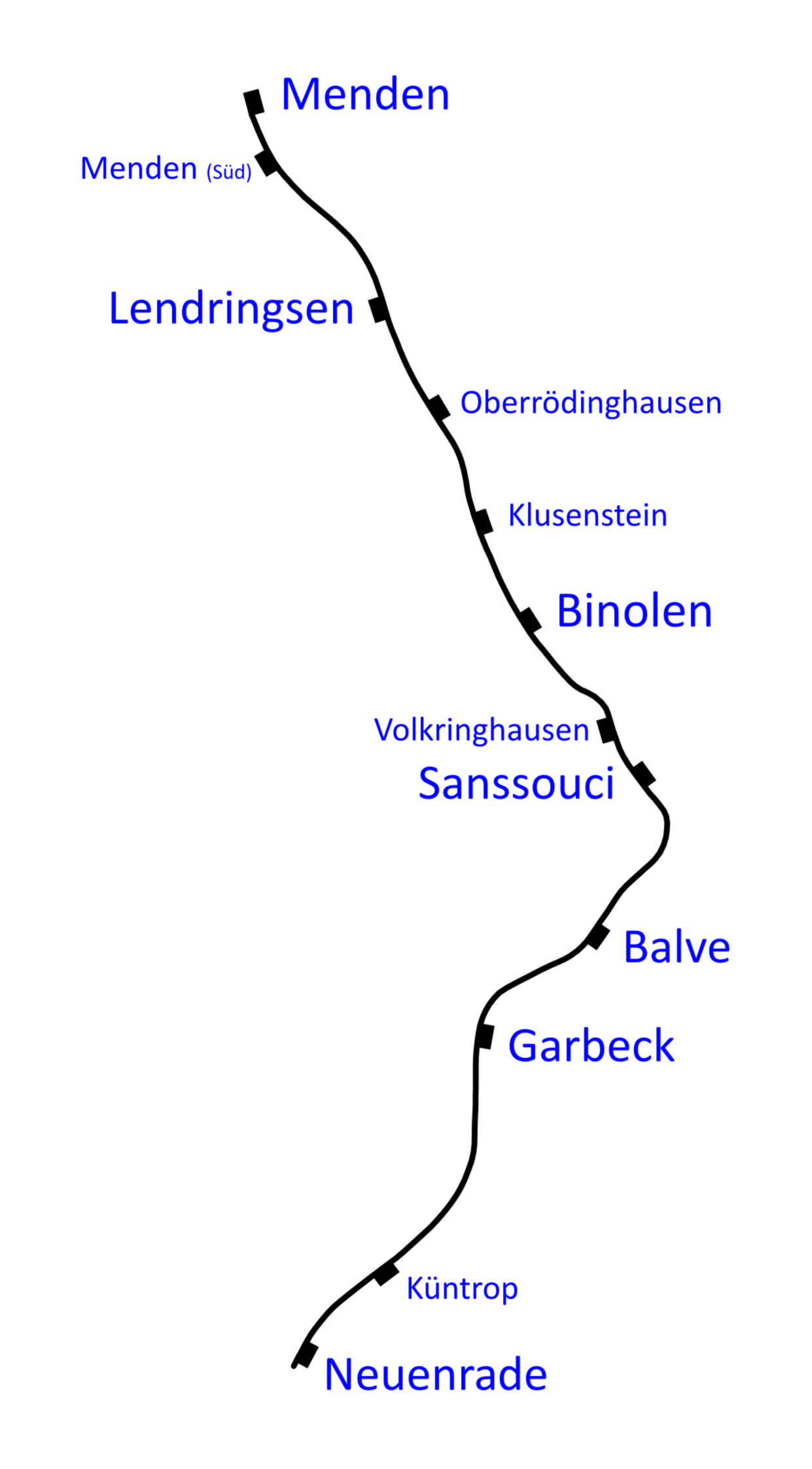 Die Karte rechts zeigt alle Bahnhöfe und Haltepunkte der Hönnetalbahn, also auch die später hinzu gekommenen Haltepunkte Menden Süd, Oberrödinghausen und Volkringhausen.